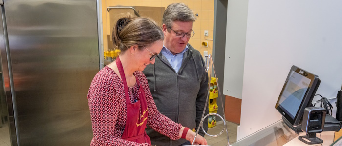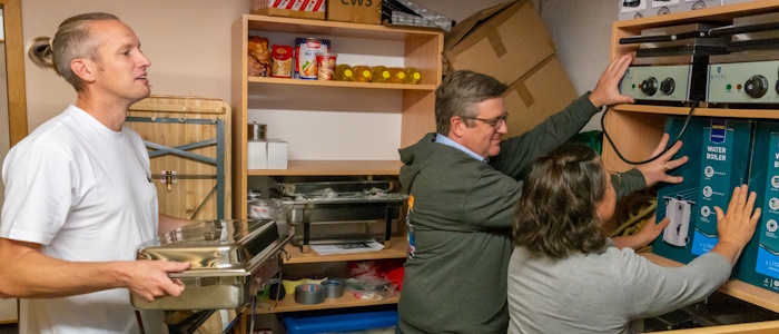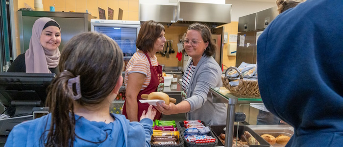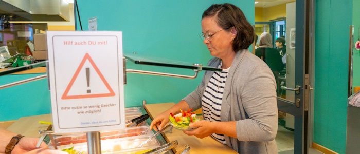 Im Saal mit den deckenhohen Fensterfronten ist es heute Mittag wieder laut, ringsum ertönt Gelächter, Stimmengewirr und über allem das klappernde Geschirr zahlreicher hungriger junger Menschen. Eine Schlange hat sich vor der Theke gebildet, hinter der Eltern das Essen an die Schülerinnen und Schüler ausgeben. Sonja Vater, Lennart Höring und Mark Lübbert bewirken mit ihrem organisatorischen Enthusiasmus, dass jeden Tag genug Mütter und Väter als Hilfen da sind, damit die Caféteria gemeinnützig funktionieren kann. „Wir haben alle einen gemeinsamen Kalender, in dem jeder einträgt, wann er mithelfen kann. Wir drei übernehmen die Verantwortung, dass da keiner alleine steht und müssen deshalb regelmäßig nachfragen: Hat noch jemand Zeit? Die spezielle Chat- und Newslettergruppe ist dabei sehr hilfreich.“