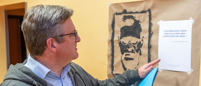 Beim Verlassen der Caféteria sieht man im Schulflur ein Zitat Dietrich Bonhoeffers, des Namensgebers der Schule: „Viele Menschen haben alles zum Leben, aber nichts, wofür sie leben“, erinnern die Worte des Widerstandskämpfers. Diese Kritik scheint an dieser Schule weder die Eltern noch die Lernenden zu treffen. Die Eltern wissen, wofür sie sich engagieren: „Das alles, was wir hier sehen“, betont Lennart Höring stolz, als er seinen Blick über den Schulhof gleiten lässt, das „grüne Klassenzimmer“ mit seinen Sitzsteinen, den Betonteilen und dem jetzt eingefahrenen Sonnensegel, „wurde mit Mitteln des Fördervereins, dem Förderpreis, Sponsorengeldern und den Einnahmen aus der Caféteria finanziert – das waren rund hunderttausend Euro.“ Und man merkt ihm seine Freude an, als er schildert, wie er es arrangiert hat, dass die 500 Kilogramm schweren Steine im Hof rechtzeitig versetzt werden konnten, um einer neu gelieferten runden Tischtennisplatte aus Beton Platz zu machen: Ein Elternteil kam bereitwillig mit seinem eigenen Bagger vorbei und erledigte alles Notwendige.