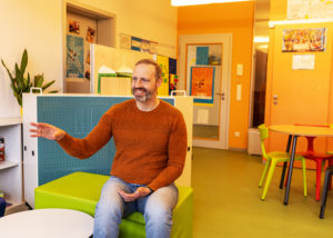 Mit „alle“ meint er nicht nur das Kollegium, das etwa beim monatlichen Jour fixe – „einem echten ‚Auskotztermin‘, der aber immer lösungsorientiert und deswegen extrem hilfreich ist“ – möglichen Frust kanalisieren und alles besprechen kann, was nicht rundläuft. Zur Schulgemeinschaft zählen genauso die Schülerinnen und Schüler, deren Eltern und auch die Menschen aus der angrenzenden Wohngegend. „Wir betrachten die Schule als einen total agilen Ort“, erklärt Micha Pallesche. „Wir kooperieren mit Hochschulen und Firmen, laden Experten zur Unterstützung ein und besuchen selbst die Menschen in unserem Viertel, um auch dort zu lernen.“