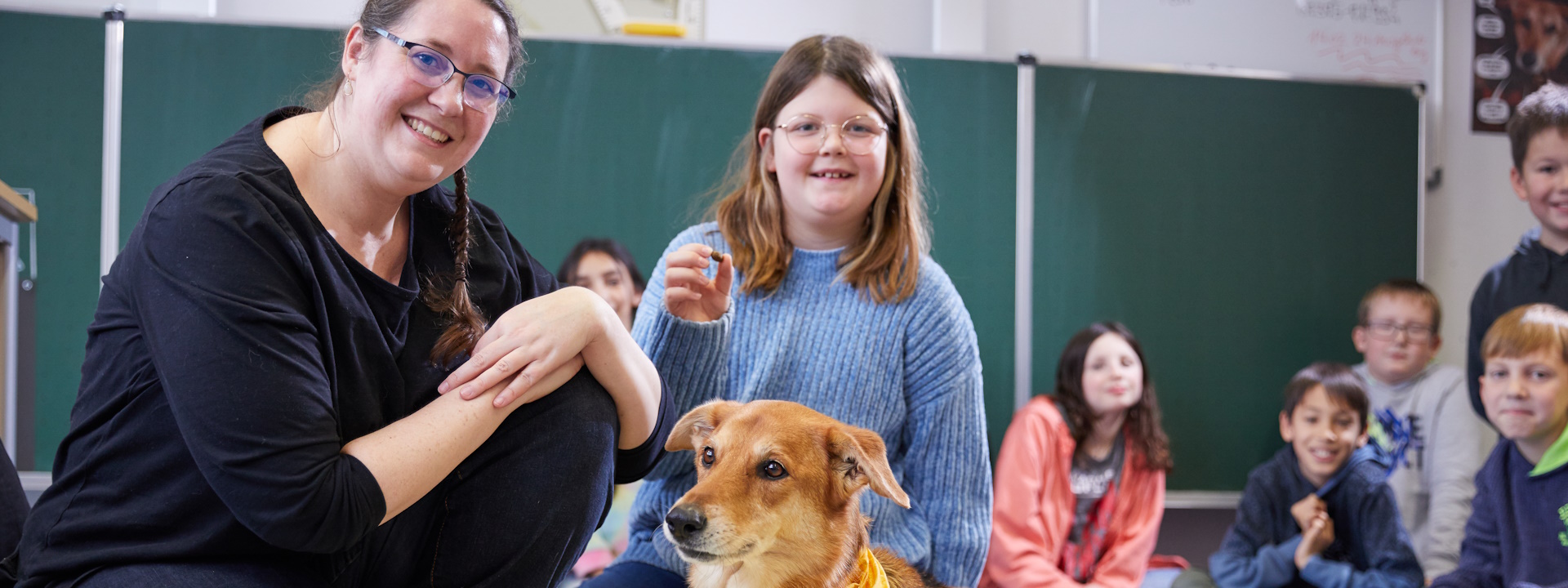 Ein fester Blick und eine kleine Handbewegung reichen, schon spitzt Hündin Mia ihre Ohren. Mit wachen Augen beobachtet sie ihr Frauchen. Die instruiert gerade ihre Klasse: „Immer nur einer von euch darf Mia ein Kommando mithilfe der Leckerli-Dose geben.“ Dazu sollen die Schülerinnen und Schüler einzeln nach vorne kommen, die Dose schütteln und Mia mit eindeutiger Geste zeigen, dass sie einen der Kunststoff-Knochen aufheben und bringen soll. Auf jedem Knochen steht ein Wort, das einen Gegenstand benennt. „Ihr müsst dann entscheiden, ob der eher klein oder groß ist“, sagt Anna Roos. „Wenn er klein ist, gehen wir alle in die Hocke und machen uns alle ganz klein, wenn er groß ist, recken wir uns in die Höhe.“