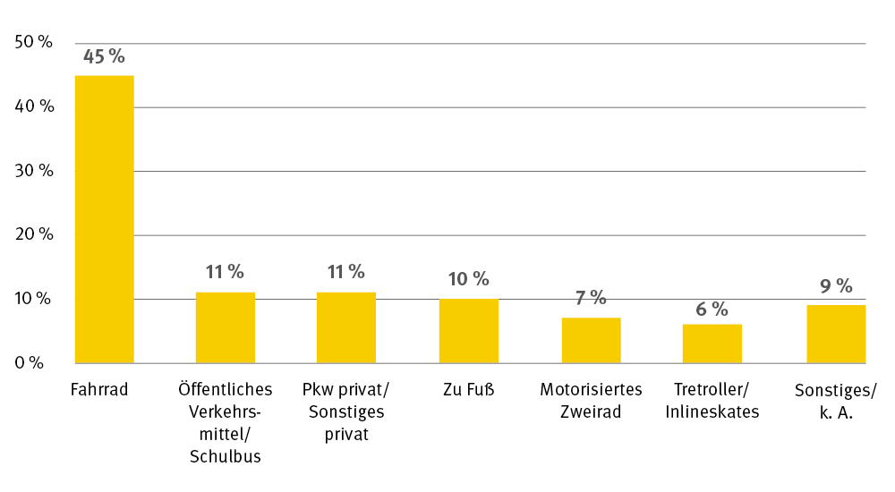 Straßenverkehrsunfälle bilden damit die Mehrheit unter den Schulwegunfällen. Doch kann man aus den Zahlen ableiten, welches Verkehrsmittel „das sicherste“ ist? Die Statistiken liefern Ansätze, ermöglichen jedoch keine Aussagen über die relativen Risiken der einzelnen Verkehrsmittel, betont die DGUV. Dafür müsste man die Unfallzahlen ins Verhältnis zur Gesamtzahl aller Schülerinnen und Schüler setzen, die das jeweilige Verkehrsmittel nutzen, was die Datenlage nicht zulässt. Tendenzen sind aber erkennbar: Im Jahr 2023 waren 20.180 von insgesamt 44.663 Straßenverkehrsunfällen an allgemeinbildenden und berufsbildenden Schulen Fahrradunfälle. Diese lagen damit weit vor anderen Formen der Verkehrsbeteiligung.