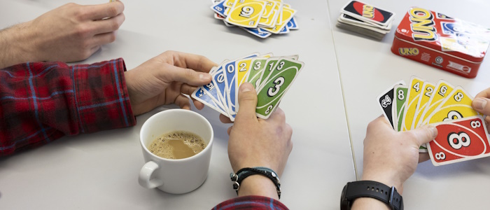 Schüler der Adolf-Reichweinschule in Nürnberg spielen Karten. Entspannung beim gemeinsamen Kartenspielen im Café10.