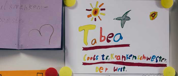 Als sich abzeichnete, dass das Land Brandenburg das Modellprojekt nach 2021 nicht weiter finanzieren würde, hätten sich das gesamte Kollegium und die Schülerschaft mit Plakaten und Bildern vor dem Landtag in Potsdam für Tabea Müllers Stelle eingesetzt. Ein selbst gemaltes Bild hängt jetzt noch in ihrem Krankenzimmer, darunter der Satz: „Frau Müller ist die coolste Krankenschwester der Welt.“ Sie lächelt. „Das hat mich echt gerührt und mir gezeigt, wie sehr ich hier geschätzt werde“, schwärmt sie und beginnt, sich für ihren nächsten Einsatz vorzubereiten: eine Lehrstunde zum Thema Handhygiene. Als Gesundheitsexpertin stärkt sie nämlich mit Präventionsarbeit die Schülergesundheit. Mit einem dicken Ordner unterm Arm und einem kleinen Koffer in der Hand wechselt sie hinüber in den Unterrichtsraum der 5a. Lehrerin Kerstin Birkholz begrüßt sie freudig. Sie war anfangs Patin von Tabea Müller, hat ihr geholfen, in die Routine des Schulalltags hineinzufinden. Ausgemalte Bilder von blaugelben Friedenstauben kleben an den Fensterscheiben. „Der Krieg in der Ukraine ist natürlich kein Tabuthema und wurde auch schon zu einem Fall für Frau Müller. Einige der Kinder waren nach einem Gespräch emotional so aufgelöst, dass ich sie zu ihr geschickt habe. Sie konnte helfen und ich mit dem Unterricht fortfahren“, erzählt Kerstin Birkholz dankbar.