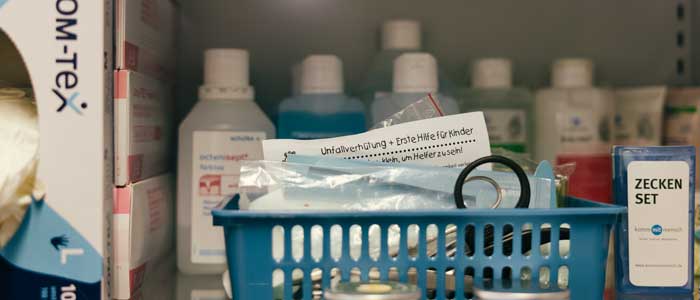 In dem eigens dafür geschaffenen Krankenzimmer wirkt Tabea Müller so in ihrem Element wie eine Gärtnerin im Gewächshaus. Hell ist ihr kleiner Raum. Tabea Müllers Schreibtisch ist am Fenster, auf dem Waschbecken stehen diverse Tuben Desinfektionsmittel, daneben an der Wand die Krankenliege. Auf einem kleinen Tisch liegen Kinderbücher. Ein Raumluftbefeuchter versprüht einen angenehmen Duft. „Die Kinder lieben das, besonders Lavendel“, sagt sie. Ein großer Medizinschrank hält Erste-Hilfe-Material bereit. So kann sie kleinere Wunden oder Prellungen vor Ort behandeln, bevor die Kinder in eine Arztpraxis geschickt werden. „Schürfwunden nach der Hofpause sind der Klassiker“, so Müller. Außerdem liegt hier frische Unterwäsche in Plastikboxen für den Notfall bereit. „Manchmal schaffen es die Erstklässler nicht rechtzeitig auf die Toilette, dann können wir mit Wechselkleidung aushelfen.“ Tabea Müller kümmert sich auch um chronische Krankheiten wie Diabetes. Eine Viertklässlerin hat ihr zweites Blutzuckermessgerät im Krankenzimmer. So braucht sie es nicht zwischen zu Hause und Schule hin und her zutragen – und hat keine Sorge, es zu vergessen. „Zurzeit ist ihr Wert sehr schwankend, das müssen wir im Auge behalten“, sagt die Pflegefachkraft und verweist damit auf einen weiteren Vorzug ihrer Präsenz: Anzeichen von gesundheitlichen Veränderungen bei Schülern und Schülerinnen rechtzeitig erkennen und den Eltern mitteilen. Sämtliches Verbrauchsmaterial aus dem Krankenzimmer wird über das Budget der Schule finanziert.